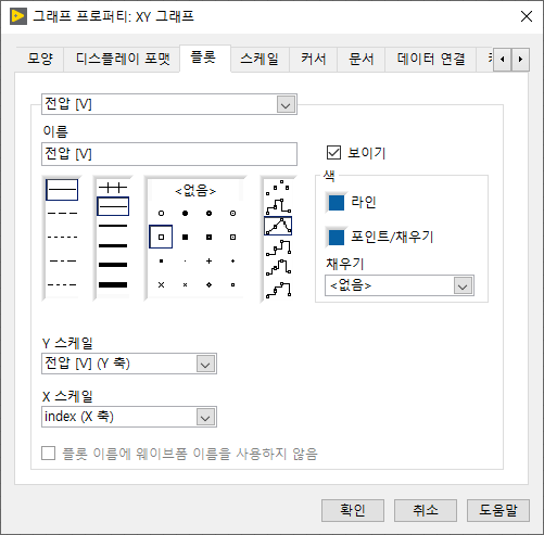 4. 그래프의 프로퍼티에서 플롯을 선택하고, 전압은 Y스케일을 전압 [V]를 선택하고, 전류는 Y 스케일을 전류 [A]를 선택해 줍니다.