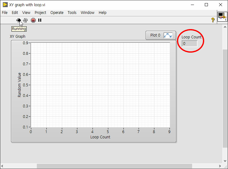 랜덤 함수가 일종의 전압이나 전류를 측정하는 함수라고 가정해 봅시다. 아래 코드에서는 다음 ms까지 기다림 함수에 의해서 루프가 300 ms에 한 번씩 총 10번을 반복하고 종료합니다. 그래프는 총 3000 ms, 즉 3초가 지난 후에 디스플레이됩니다. 프론트 패널 gif를 참고해 주세요.
